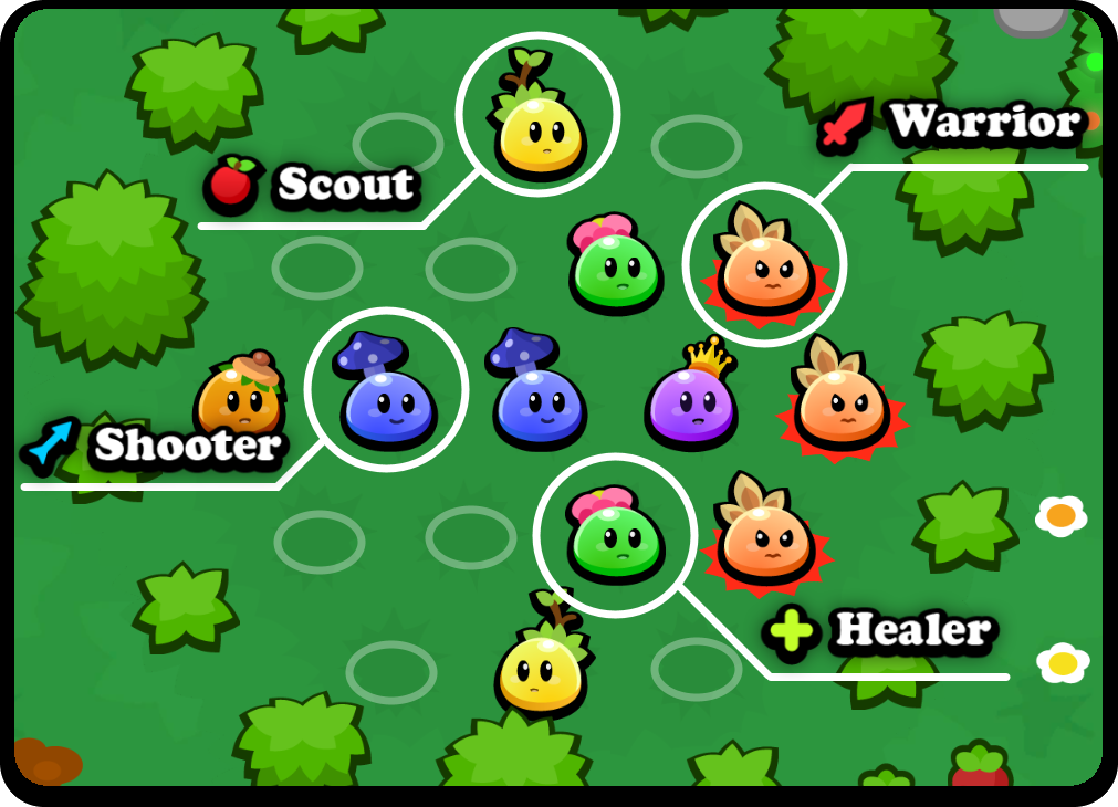 Form your squad by choosing from different types of slimes, each with their own unique abilities and roles. Some have high damage and health, some are good at shooting, some heal the squad, and some increase the amount of resources collected.